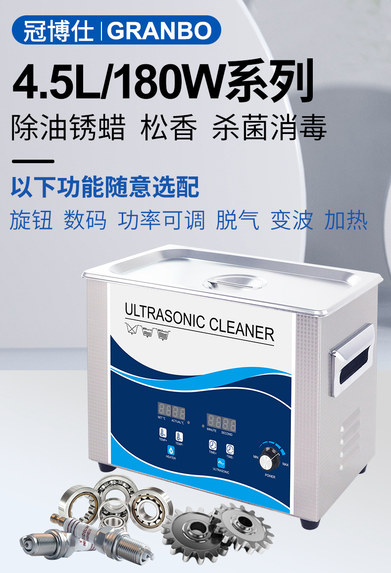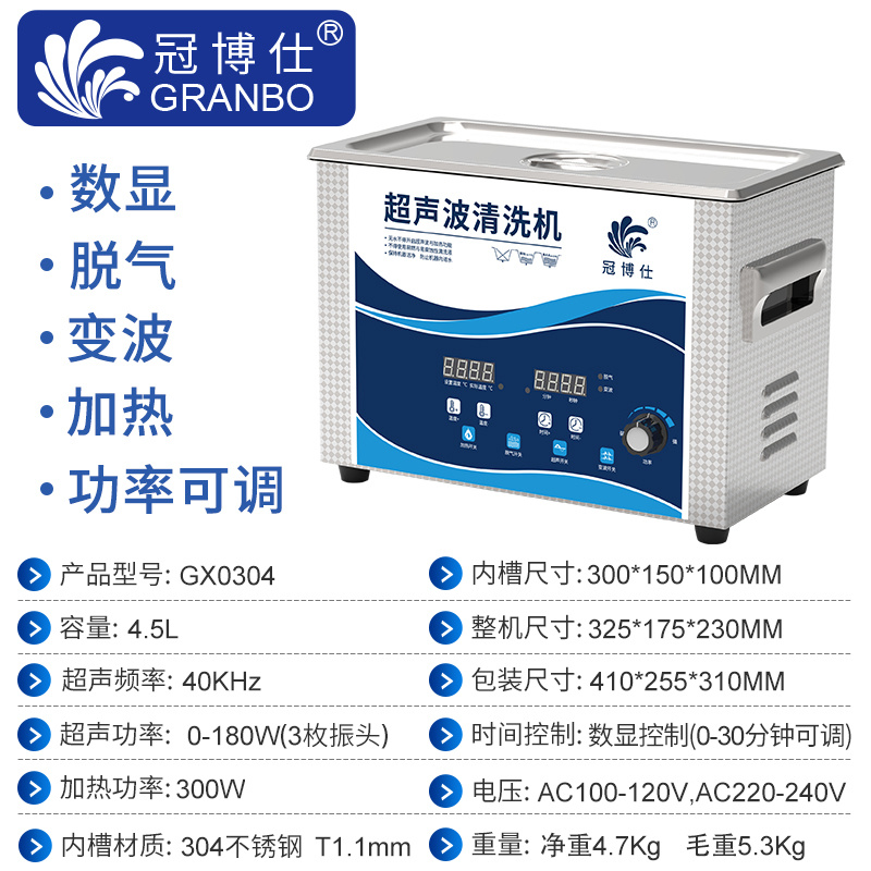 冠博仕GX0304超聲波清洗機|4.5L/180w|功率可調 數碼變波脫氣 帶加熱