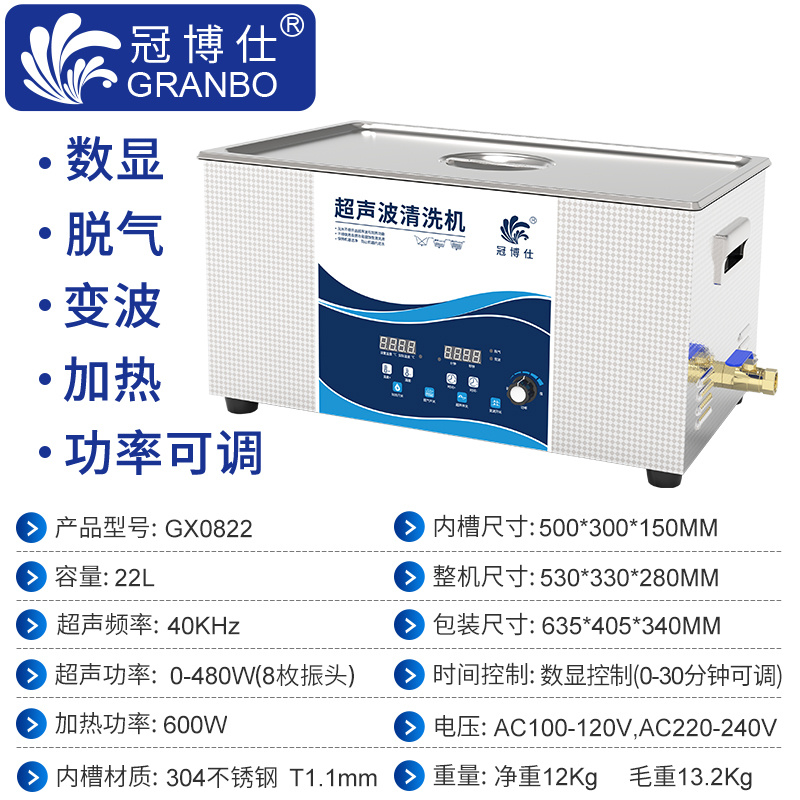 冠博仕GX0822超聲波清洗機|22L/480W|功率可調 數碼變波脫氣 帶加熱