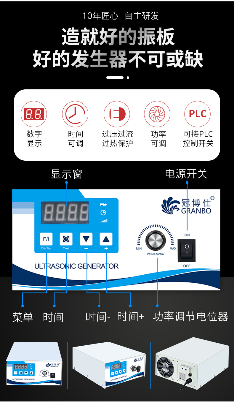 超聲波震板、發生器、發生器電源、說明書、合格證保修卡、內置珍珠泡沫。